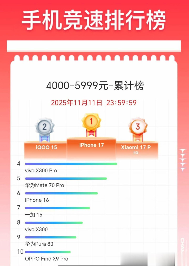 这个教育段基本上是安卓旗舰和苹果标准版必争之地呀,前三名分别是iPhone17,iQOO 15和小米17 Pro,看到这里,虽然苹果标准版销量高,但是国产的两款旗舰也是紧随其后,然后剩下像新品旗舰vivo X300系列,一加15,OPPO Find X9系列的新品都有,只是排名不同而已。