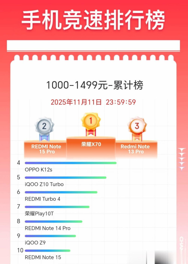 前三名分别是红米K80,红米 Turbo4 Pro和荣耀200,看到这里我想说一句荣耀200都是上上代的产品了,没想到还能上榜,所以还是那句话,每年大促期间,荣耀X系列还有数字系列上榜的次数真的很高。