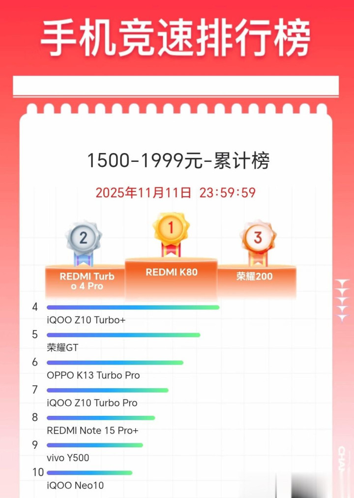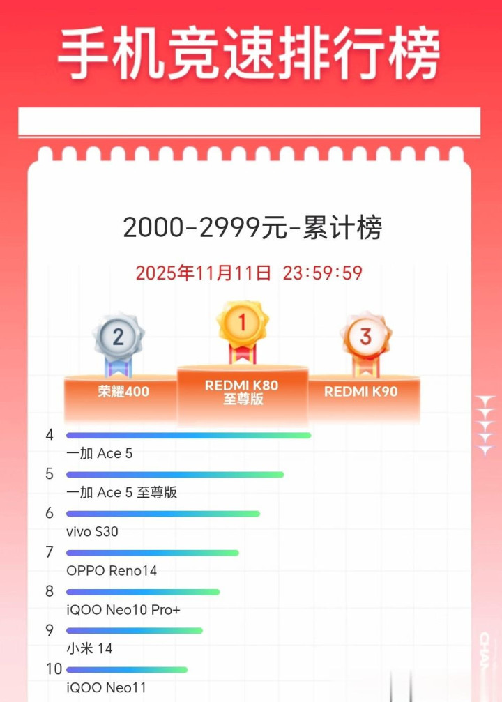 前三名分别是红米K80至尊版,荣耀400和红米K90,今年荣耀400系列的销量挺高的,凭借7200mAh的电池,在同价位还是很有竞争力的。