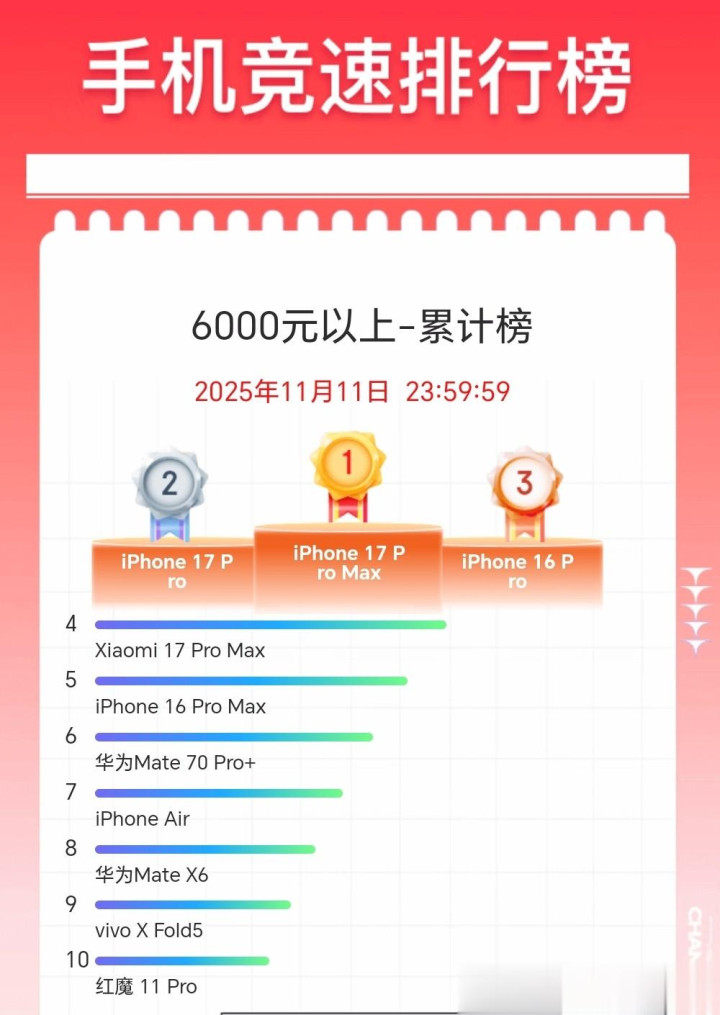 前三名相比于累计榜的还是有变动的,第一名仍然是iPhone17 Pro Max,第二名是iPhone17 Pro,第三名是iPhone16 Pro,大家注意一下第四名,是小米的17 Pro max,这手机是今年的新品。也冲上了第四名,不错。