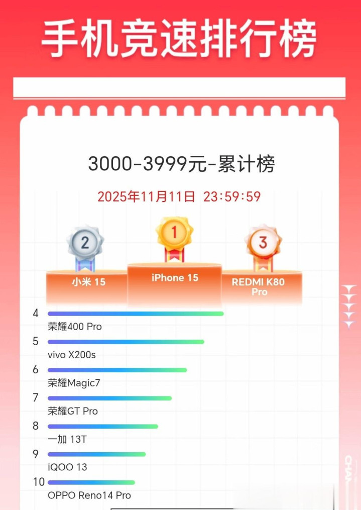 这个榜单的第一名依然是iPhone的机型,iPhone15,剩下是小米15和红米K80 Pro,也都是上代的旗舰产品,剩下基本上都是国产的产品了,这个榜单只有一个iPhone15,毕竟价位在这里了。